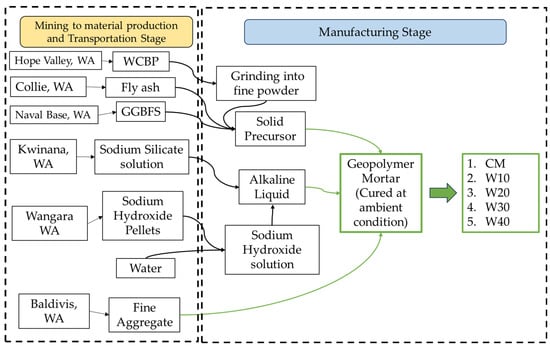 The objective of the LCA investigation was to evaluate and contrast the environmental effects of five different geopolymer mortar samples that were manufactured. Each mortar sample contained varying proportions of WCBP, which served as replacements for the fly ash component in the fly ash–GGBFS-based geopolymer mortar samples. GGBFS content was constant for each mix. A 12 M sodium hydroxide and sodium silicate solution was used as the alkaline activator to produce geopolymer mortar samples. Each variety of mortar mix underwent curing at room temperature. The LCA aimed to generate normalized data tailored to Australian economic and environmental conditions, enabling the creation of an eco-efficiency portfolio that evaluates the eco-efficiency of each mortar sample. The system boundary encompasses all stages from the mining to material production, transporting those materials to the construction site and manufacturing geopolymer mortar, as shown in Figure 1. The manufacturing phase comprises energy usage related to processes like mixing, compacting, and curing. Figure 2 illustrates the complete manufacturing and curing process of geopolymer mortar mix.
