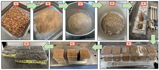 Manufacturing and curing process of WCBP-based geopolymer mortar (W40) ((A) Brick aggregate; (B) WCBP; (C) dry mixing; (D) geopolymer mortar mix; (E) pouring the mortar mix into mold; (F) after finishing casting; (G) 50 mm cube mortar sample after demolding; (H) curing).