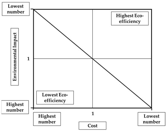 Figure 3 illustrates a two-dimensional diagram depicting the normalized costs and environmental impacts for eco-efficiency analysis. This depiction is commonly referred to as the eco-efficiency portfolio. The horizontal axis represents normalized costs, while the vertical axis corresponds to environmental impacts. The scale ranges from the lowest numbers indicating the lowest impact and least cost to the highest numbers representing the highest impact and the highest cost values. The utmost eco-efficient option is identified by its space above the diagonal line, with the mix farthest from this diagonal line representing the most eco-efficient mix (Kicherer et al.) [].