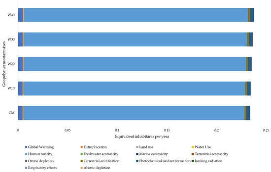 Figure 4 illustrates the environmental impact analysis of five geopolymer mortar mixes in terms of the per inhabitant equivalent. The environmental impact is most pronounced in geopolymer mixes featuring 40% WCBP, followed by those with 30%, 20%, and 10% WCBP, as well as the CM mix, in that order. To provide specific percentages, the W40 sample exhibited a 1.7% higher environmental impact compared to the CM mix, W30 showed a 1.17% increase, W20 displayed a 0.69% rise, and W10 demonstrated a 0.31% increment.
