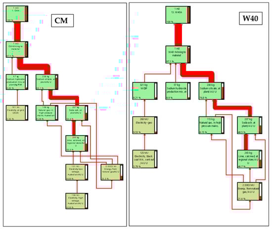 Figure 5 presents the flow network diagram for energy consumption for the CM and W40, created by SimaPro software. This flow network helps to identify the hotspots for each geopolymer mortar mix. In the case of the CM cured under ambient conditions, the mining to material stage was identified as the primary hotspot. This phase constituted 95.5% of the total energy consumption. Within this, 82.2% of the energy consumption was attributed to sodium silicate production at the batching plant, with an additional 9.04% stemming from sodium hydroxide production. In the case of the W40 mix, featuring a high WCBP content, 8.21% of the energy was consumed in grinding brick aggregate into WCBP. Subsequently, energy consumption was distributed as follows: 76.8% in the production of sodium silicate and 8.9% in the production of sodium hydroxide, both at the batching plant.