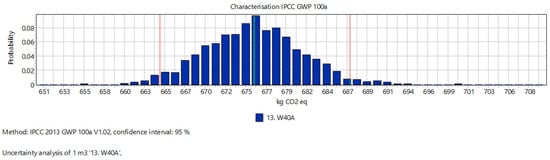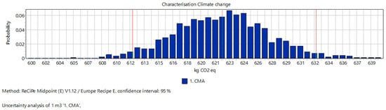 This study used emission factors derived from both local and foreign databases for construction materials, which could affect the accuracy of LCA results to some extent. To address these uncertainties, a Monte Carlo simulation (MCS) was performed based on Clavreul’s approach [] to analyze uncertainties for each data point and forecast their influence on the LCA outputs for geopolymer mixes. The simulation process was performed for 1000 iterations for a confidence level of 95% [].