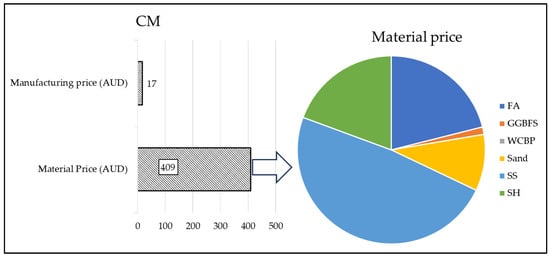 The cost of transportation was approximated at AUD 0.09 per ton–kilometer for road freight in accordance with the details provided by the Australian Government Department of Infrastructure and Regional Development []. The electricity cost during the manufacturing process was derived from publicly accessible information published on the Synergy website []. It was assumed that the electricity tariff corresponded to the Synergy business plan and was priced at 36.15 cents per unit (equivalent to 1 kWh) [].