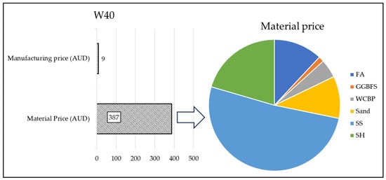Figure 8 and Figure 9 show the breakdown of LCC analysis for CM and W40 geopolymer mixes, respectively. In the study of the both CM and WCBP-rich sample, the cost analysis revealed that the costs of alkaline activator had the most significant influence, contributing to 95.9% and 97.6%, respectively, of the total material expenses. This cost was further broken down to identify the cost hotspot. Sodium silicate, constituting 48.56% of the cost for CM and 51.3% of the cost for W40, was identified as the hotspot, followed by sodium hydroxide (19.38% for CM and 20.47% for W40). The slightly elevated cost of fly ash is accountable for the increased expenses in the CM sample compared to the WCBP-rich samples.