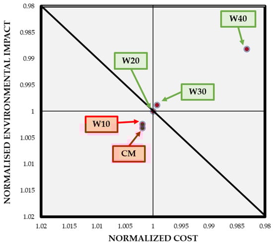 Subsequently, Figure 10 illustrates the techno-eco-efficiency portfolio for geopolymer mortar mixes. According to the portfolio analysis, W20, W30, and W40 geopolymer mixes exhibited techno-eco-efficiency, while CM and W10 samples are deemed not technologically and economically efficient. Despite the higher environmental impact observed in WCBP-rich samples outlined in Section 3.1, the EI/MPa values declined with an increasing WCBP percentage in geopolymer mortar mixes, owing to their elevated compressive strength. For instance, the W40 sample exhibits a total normalized environmental impact of 0.24 with a compressive strength of 91.87 MPa, while the CM has a total normalized environmental impact of 0.23 with a compressive strength of 72.38 MPa. Consequently, the EI/MPa value for CM is greater than that of the W40 sample.
