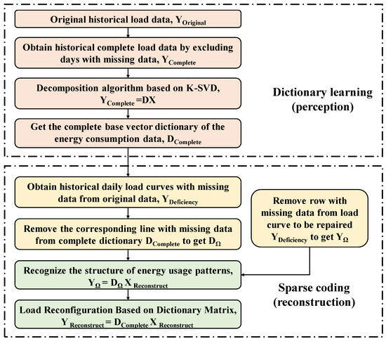 The data filling method based on K-SVD proposed in this paper is shown in Figure 1. It consists of two main parts: one involves dictionary learning, which perceives the energy usage patterns of the buildings. The second involves sparse coding and reconstructing the missing load data. The training samples are used to obtain the complete dictionary based on the K-SVD decomposition algorithm. Then, the row with missing and the corresponding rows in the dictionary are eliminated, and sparse coding identifies the structure of the energy consumption patterns to obtain the base vectors of the sample to be repaired.