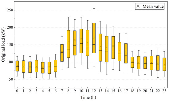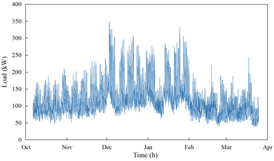 To verify the effectiveness of the proposed K-SVD method, the energy data of a hospital building in Wuhan from 31 October 2021 to 18 April 2022 are used. The local climate is hot in summer and cold in winter, and no district heating is supplied in the region. Totally, the hourly load data of 170 days are obtained, as shown in Figure 2. It shows that the energy consumption is higher from the end of December to February of the following year due to the heating demand of the building. The load is lower in the remaining months due to the transitional season. The hourly load distribution is shown in Figure 3. It shows that energy usage is higher from 7:00 to 17:00 due to the working hours of the building. The energy consumption is stable and lower during the non-working hours.
