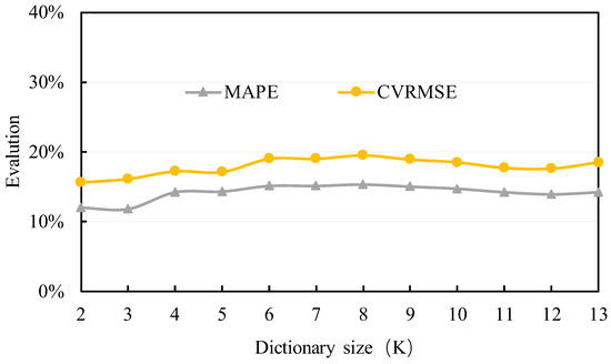 The MAPE and CVRMSE of the data filling method based on K-SVD under different dictionary sizes.