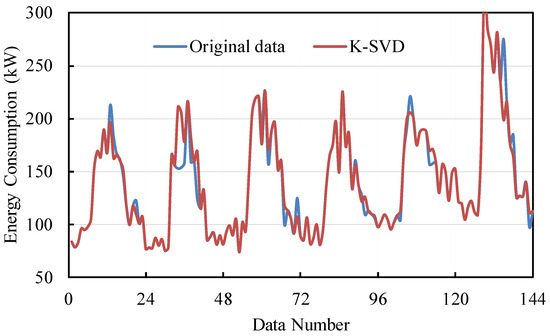 The energy consumption data of buildings generally exhibits features of times series, sparsity, and diversity [34]. The sparsity means that the daily load of the customer can consist of several sub-modes linearly. The diversity refers to the randomness and start–stop characteristics of the customer’s electricity consumption. The machine learning method, the K-SVD algorithm, perceives dictionaries for sparse representation. It is widely used in compressing facial images, face recognition, and camera calibration [35,36,37]. Load data can be expressed with these dictionary atoms linearly and sparsely [38]. It should be an effective method for data filling in building energy systems. Therefore, in this paper, a filling method based on K-SVD is proposed to fill the missing and abnormal energy consumption data of buildings. The performance of the proposed method is compared with the traditional method to validate the filling effect. The impact of factors such as the dictionary size, the missing characteristics, and the sample sizes are investigated.