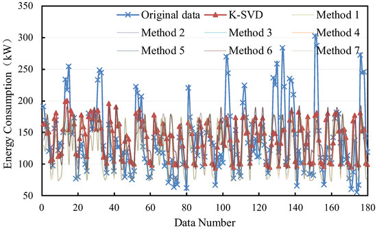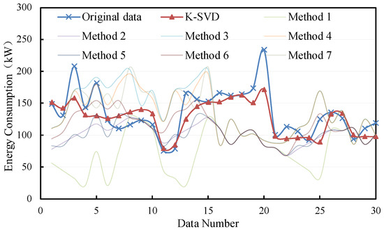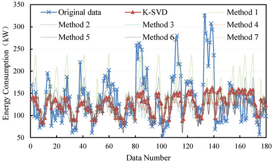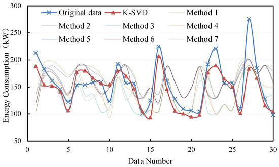 The filling results of the proposed K-SVD method compared with traditional methods are shown in Table 2. It can be observed that the K-SVD method demonstrates a higher accuracy under the smaller learning sample size. The MAPE is between 9.3% and 9.4%, and the CVRMSE is between 12% and 17.1%. When the training sample is larger, the MAPE and CVRMSE are increased by 14.7–20.1% and 16.3–17%. When the sample size is small, the learned dictionary is more likely to capture the intrinsic features of the energy usage patterns. It can enhance the performance of imputation. In addition, the filling performance of all methods is better under non-consecutive missing compared with consecutive missing. The priority of the K-SVD-based filling method is stronger under smaller learning samples, with a much lower MAPE and CVRMSE.