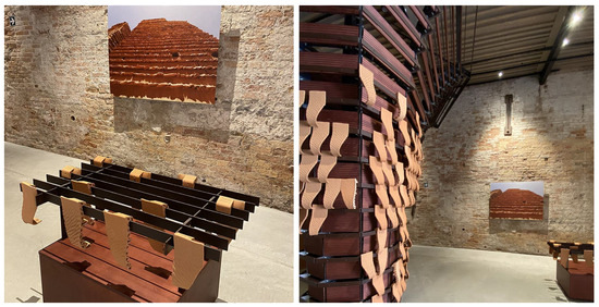 Furthermore, Saudi Arabia participated in the 18th International Architecture Exhibition, La Biennale di Venezia, which began in May and ended in November 2023, with an exhibition entitled IRTH (in Arabic, it means legacy or prized possession). In response to the theme of the current edition of the exhibition, titled “The Laboratory of the Future”, the National Pavilion of Saudi Arabia delves into the tangible and intangible qualities of materials of Saudi architecture in an interactive journey that uses the earth as a starting point for this exploration, combining it with experimentation with organic materials. The pavilion explores the dialogue between vernacular lenses and material topographies and between tradition and innovation, material and immaterial, reflecting on the future through nostalgia. The exhibition aims to pay tribute to Saudi vernacular architecture and the evolution of the country’s landscape. Inside, the pavilion is crossed by a series of arched doors accommodating ceramic tiles. These sinuous tiles are reminiscent of desert dunes; they were printed with 3D printing and convey mass and lightness (Figure 1).