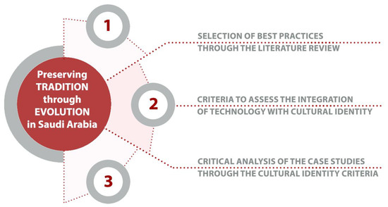 In an era marked by globalization and rapid technological advances, architectural practice has significantly expanded, driven by technological advancements and cultural resilience [6]. These technologies are reshaping our understanding of the physical environment [7]. Consequently, the goal of preserving cultural identity has become paramount for many countries. Saudi Arabia is at the forefront of adopting methods oriented toward sustainability while maintaining local identity, aligning with the objectives of Saudi Vision 2030. Furthermore, UNESCO affirms that no development can be considered sustainable without including the “culture” and the “full integration of culture into sustainable development policies” [8]. The aim is to preserve tradition through evolution, which means learning from the past and shaping the future, not by copying it but by evolving it using avant-garde sustainable techniques within the nation’s borders, positioning Saudi Arabia as an international leader in integrating technology and culture [9].