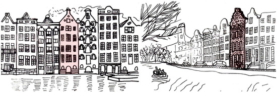 Figure 4. On the left, a view of the traditional houses of Amsterdam; on the right, the 3D Print Canal House as a contemporary interpretation of the past (credit: Monica Moscatelli 2024).- Design elements. The picturesque landscape of Amsterdam is made up of a network of canals overlooked by buildings dating back to the Golden Age, i.e., the period that coincides with the political triumph of the state. The urban design of Amsterdam has an exceptional feature, with houses placed on narrow lots due to the high taxes payable in the 17th century related to the size of the land. Therefore, the architecture was characterized by narrow houses with several floors. The 3D Print Canal House recalls Dutch colonial architecture by occupying a narrow lot overlooking one of Amsterdam’s canals. The 700 sqm house is 6 m high, narrow, and deep and has a sloping roof: a perfect union of coexistence between the past and an innovative future constantly developing.