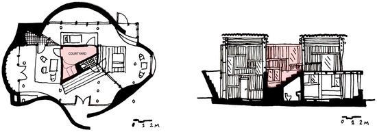 Figure 7. Traditional House of the Future: on the left, the spatial organization around a central courtyard; on the right, the house’s section with the central space (credit: Monica Moscatelli 2024). - Material selection. The perfect harmonization of innovative 3D-printed construction and traditional timber-framing techniques characterizes the house. This mix of contemporary and traditional techniques serves to rethink the concept of the traditional wooden house, embracing contemporaneity while respecting cultural identity. Three-dimensional printing simplifies construction processes by reducing waste [43,44].