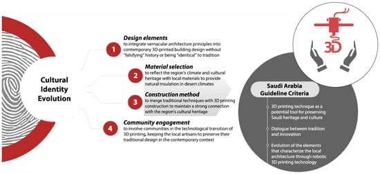 The best experience-based design strategies for the development of 3D-printed architecture were identified from the previous comparison matrix and divided into four cultural identity criteria. These criteria could be applied in Saudi Arabia, showing a possible transfer of knowledge and an evolution of vernacular architecture with innovative technology. Saudi Arabia is a vast territory with different architectural styles, depending on the region. We can identify at least six different native architectures: the Najd architecture of Riyadh and the Central Region, the architectural style of the Western Region (Hijaz, Makkah, and Madinah), the native architecture in the mountain site of Asir, Abha and Khamis Mashayt, the architecture of the Southern Region (Jazan, Najran, Farasan Islan, and Thiama), the architectural style of the northern territories (Hail, Qasim, Buraidah, Tayma), and finally, the native architecture of the Eastern Region and the Gulf Coast [47]. This diversity of native architecture, along with its history, form, character, and aesthetic quality, highlights the importance of the vernacular architectural heritage of Saudi Arabia [48]. Due to the adaptation to modern life, rapid changes occurred across Saudi Arabia, leading to a loss of identity for cities by adopting new and contemporary lifestyles and abandoning the traditional way of life [49]. The development of new buildings built with advanced technologies, such as 3D printing, must integrate the elements that characterize each region’s different architectural styles, leading to an evolution of cultural identity and avoiding loss. The following four criteria represent generic guidelines for a cultural reflection applied to Saudi Arabia, which led to an evolution of the main elements that characterize the architectural styles of the different regions (Figure 11):