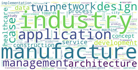 This study identifies the various industry domains that implement digital twin technology. Figure 1 manifests a word cloud generated from extensive analysis of 300 selected academic papers retrieved using the descriptor “digital twin”. Immediately dominant terms, such as “industry”, “design”, “application”, and “manufacture”, show the vital role digital twins play in contemporary industrial design and manufacturing schema. Words such as “data”, “network”, and “architecture” show the importance of interconnected systems and the rise of data-driven approaches in digital twin research. At the same time, mentioning “healthcare”, “construction”, and “management” shows how widely digital twin technologies are used in different fields. Overall, this word cloud offers a clear picture of the main topics in digital twin research.