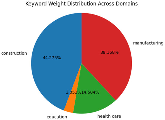 Figure 2 illustrates the domain classification derived from the titles of the extracted papers. Domains were automatically categorized through keyword extraction, and the significance of the keywords representing each domain was weighted based on their frequency. The pie chart demonstrates that “construction” and “manufacturing” emerge as dominant domains, accounting for 44.3% and 38.2%, respectively. This underscores the heightened relevance and application of digital twin paradigms within these sectors. The “health care” domain constitutes 14.5%, indicating its growing intersection with digital twin technologies. In contrast, “education” represents the smallest segment at 3.1%, suggesting a nascent yet evolving exploration of digital twin applications in this sphere. Collectively, the data offer a clear insight into the sectors where digital twin applications are most extensively researched and applied.