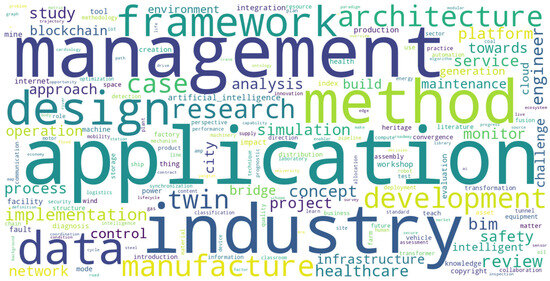 Figure 3 depicts the construction industry’s focus on “management”, “framework”, “application”, and “method” in terms of the digital twin. Compared to the general “digital twin” search, this focused query emphasizes construction-specific terminologies such as “safety”, “engineer”, “bridge”, and “build”. While terms such as “industry”, “data”, and “design” remain prevalent in both searches, the attention to practical applications and methodologies becomes more pronounced in this context.