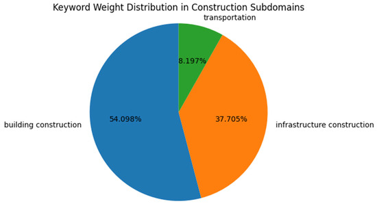 In Figure 4, the pie chart demonstrates the application areas of digital twins within the construction sector. For the categorization using keyword analysis, this study employed the following keywords and their derivative morphemes: for building construction, terms such as “building”, “architecture”, “residential”, “commercial”, “skyscraper”, “housing”, and “estate” were used; for infrastructure construction, keywords like “dam”, “infrastructure”, “bridge”, “road”, “highway”, “tunnel”, “railway”, “metro”, and “utility” were utilized; and for transportation, terms included “transport”, “vehicle”, “car”, “bus”, “train”, “airplane”, “aviation”, “shipping”, “marine”, and “logistics”. The results show that building construction dominates with 54.1%, emphasizing the important role of digital twin technology in this area. Meanwhile, infrastructure construction and transportation represent 37.7% and 8.2%, respectively, highlighting the expanding reach and potential of digital twin applications.