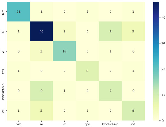 In this section, this study demonstrates the findings derived from the title analysis of papers extracted using keywords “digital twin and construction”. The objective of this analysis was to discern the core technologies for digital twin applications within the construction industry. Figure 6 presents a fascinating exploration into the intertwining of various core technologies for digital twins in the construction industry. As shown in the matrix heatmap in Figure 6, AI emerges as a dominant technology, with 46 papers exclusively emphasizing its role. VR is the subject of 16 papers, while CPS is explored in 8 papers. Additionally, the matrix also sheds light on interdisciplinary intersections. For instance, AI’s convergence with blockchain and IoT is noticeable in nine papers, indicating the combined potential of these technologies in revolutionizing the construction industry via digital twin applications. Meanwhile, BIM seems to have a more isolated application, with 21 papers centered on it and minimal overlaps with other tech domains.