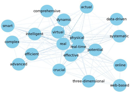Using text mining techniques, the abstracts of the selected papers were analyzed to extract significant features and advantages associated with digital twins. Before analysis, the data underwent several preprocessing steps: (1) tokenization, (2) part-of-speech tagging, and (3) stopword removal. The developed system identified sentences containing terms like “digital twin” or its abbreviations and then extracted adjectives associated with “features”, “characteristics”, and “advantages”. The extracted data, especially the adjectives, were then subjected to frequency analysis to identify the most associated characteristics and advantages of digital twins. Further, network analysis was employed, presenting a visual representation of these characteristics elucidating their interconnections and significance.