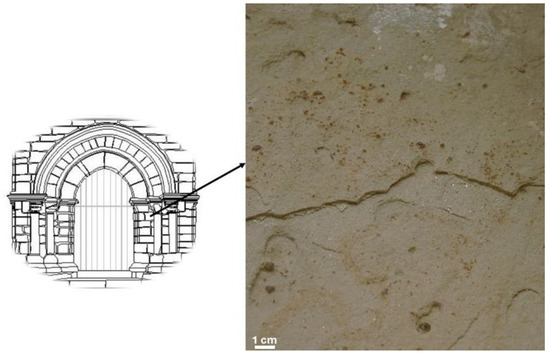 Considering that the consolidation effect was not meaningful on treated samples of the A+B lithotype and the performance of TG applications was not good due to the lower durability obtained on variety M, future consolidating treatments are not recommended by the authors in the conservation works of these stones of the monument. Additionally, due to the location of St. Leonard’s Church close to the sea, this is a major source of sodium chloride that is linked to the widespread alveolization through capillary and salt mist transportation. This monument was built in the 12th century, where salt weathering has progressed for more than 800 years to today. Figure 1 illustrates representative alveolization forms shown on a block of B variety sandstone in the south portal. As it is visible, alveolization is in an early stage in this lithotype.
