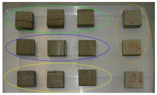 Features of the specimens after 40 cycles of crystallization–dissolution: inside the green oval, they were in the sodium sulfate solution; in the blue oval, they were in the sodium chloride solution; inside the yellow oval, they were in the sodium chloride and calcium sulfate solution; in the orange oval, they were only under the effect of deionized water; without oval, this was only under the influence of temperature.