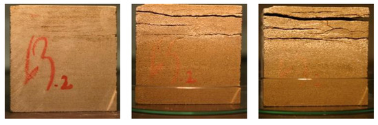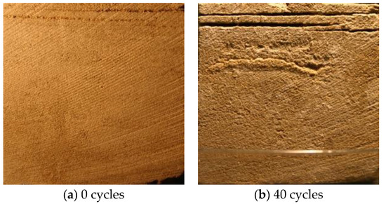 Figure 5 shows the aspect of the specimens after the tests carried out over 40 cycles. A higher degradation effect was found for the sodium chloride crystallization and dissolution cycles. These specimens showed a loss of cohesion with complete separation of laminations, reaching failure (Figure 6). The saline mixture was responsible for the same phenomenon but with lower effect (Figure 7) and caused erosion to the surface of the specimens due to the action of calcium sulfate (Figure 8 and Figure 9). The experimental results observed in Figure 5, Figure 6, Figure 8, and Figure 10 revealed that the sodium chloride solution and the mixture solution were more deleterious to the variety A sandstone during the 40 cycles of crystallization and dissolution than the sodium sulfate solution. The tensile stresses developed during the crystallization of NaCl caused a significant spacing between the laminations, which was more expressive than that observed in the crystallization of the sodium sulfate system (Figure 10).