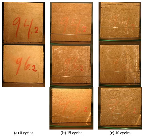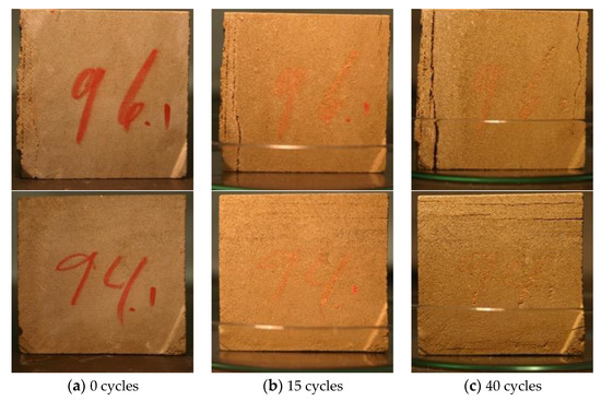 The results can be presented in the form of a photographic record of the evolution of the surface of the specimens. The indication of the number of cycles necessary for the breakage or disintegration of the specimens to occur is also required. EN 14147 [37] specifies that this failure must be verified in at least two specimens in a standard set under study to be accepted as a criterion to end the test.