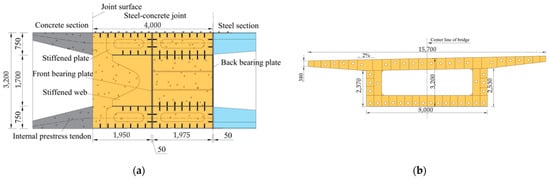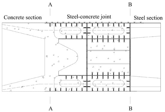 Hybrid beam bridges employ steel beams instead of concrete beams in the mid-span to reduce the self-weight of the main beam, therefore improving its span capacity and fully leveraging the material properties of both steel and concrete. Unlike composite beam bridges that utilize multiple materials on the same section [,,], hybrid beam bridges utilize different materials along the span direction. Therefore, steel–concrete joints are key structures within hybrid beam bridges, and the rationality of these joints directly impacts the safety of the bridge. With the widespread adoption of the hybrid beam bridge, such as the Xupu Bridge in Shanghai, Yongjiang Railway Bridge in Ningbo, Mawei Bridge in Fuzhou, and so on, scholars are increasingly focusing on the mechanical properties of steel–concrete joints.