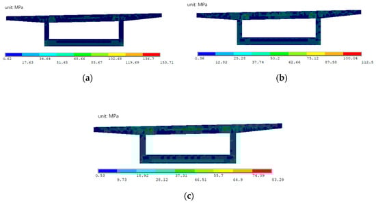 The Von Mises stress distributions in the back bearing plates with different thicknesses under working condition 1 are shown in Figure 6. At the welding positions between the back bearing plate and the stiffeners, as well as the anchoring positions of the prestressed tendons, there will be a significant stress concentration. The maximum concentrated stress values of the back bearing plates with different thicknesses are 153.71 MPa, 112.5 MPa, and 83.29 MPa. When the thickness of the back bearing plate increases, the overall level of Mises stress decreases which alleviates the phenomenon of stress concentration, making the stress distribution more uniform.