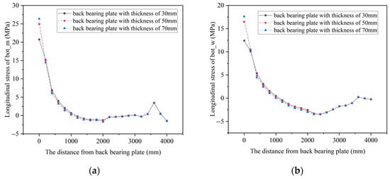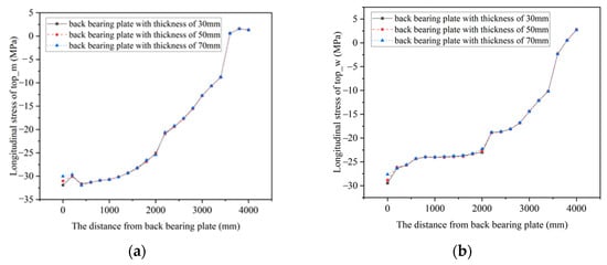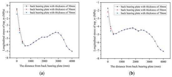 Figure 7 and Figure 8 show the longitudinal stress at each point of the steel structures in the joints with different thicknesses of the back bearing plates under working condition 1. Near the back bearing plate, the compressive stress in the steel top plate experiences a slight reduction with increasing thickness of the back bearing plate, but the effect is not significant, while the tensile stress in the steel bottom plate increases with the increase in the back bearing plate thickness. When the back bearing plate thickness changes, the stress in the top and bottom plates only changes near the back bearing plate, and there is almost no change in other positions. The impact range of the back bearing plate thickness on the stress in the steel structure is mainly between 0 mm and 200 mm. This indicates that the influence of the back bearing plate thickness on the steel structure is mainly in the vicinity of the bearing plate, and the thickness of the back bearing plate significantly affects the stress in the steel structure’s bottom plate.