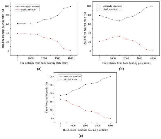 The internal force bearing ratios of the steel structure and concrete structure. (a) The bending moment bearing ratio; (b) the axial force bearing ratio; (c) the shear force bearing ratio.