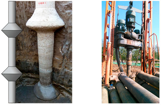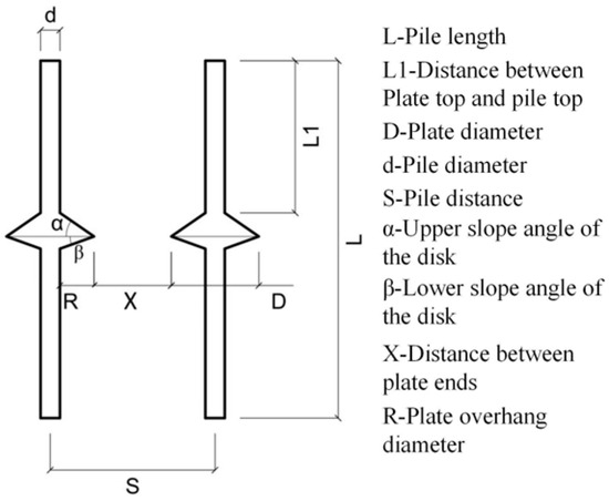 The variable cross-section pile is developed from the straight pile [1]. New Type Concrete Expanded-Plate (NT-CEP) piles have evolved and been optimized using various variable cross-section piles [2,3,4]. The additional bearing plate significantly improves the bearing capacity for compression, overturning, and especially uplifting [5], which makes it possible for NT-CEP piles to be utilized in large bridge projects, high-rise buildings, and other building groups with higher requirements for uplift capacity. Since the compressive resistance is usually much larger than the frictional resistance [6], the NT-CEP pile has obvious advantages in uplift bearing capacity compared with straight hole and equal cross-section pile [7]. During pile construction, pile-forming machines such as drilling, expanding, and cleaning machines are used to significantly shorten the hole-forming time, improve the hole-forming quality, and reduce mud discharge to the greatest extent possible for environmental protection. The NT-CEP pile, shown in Figure 1, is a type of variable-cross-section pile with advanced international usage in the pile foundation market. At present, a large number of theoretical and experimental studies have been carried out on the bearing capacity of single NT-CEP piles and soil failure around piles, and systematic research results have been achieved, such as the influence degree of different parameters on bearing capacity [8], the research on bearing capacity calculation formula [9], etc. However, research on NT-CEP pile groups is relatively lacking, which limits the development of NT-CEP piles [10,11]. The plate position was the main factor influencing the NT-CEP pile-bearing capacity, especially in the pile group layout. The research group previously studied the related performance of the same plate position (bearing plate in the same horizontal plane), but research on setting plates at staggered plate positions (bearing plates not in the same horizontal plane) has not yet been carried out. To expand our understanding of NT-CEP pile groups further, it is necessary to conduct in-depth research on the performance of an NT-CEP pile group when the bearing plates are set using staggered plate positions.