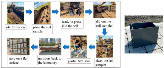 Undisturbed silty clay was collected from the stable soil layer on the construction site in Figure 4, and its specific parameters are listed in Table 2. After considering the boundary effect, a soil sampler made of 5 mm thick steel plate was set to 360 mm × 200 mm × 280 mm. During the test, the steel plate was replaced with tempered glass, as shown in Figure 4.