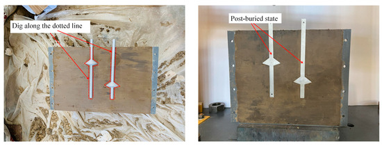 According to our previous research results, when the load-bearing plates of two piles are set at the same position and L1 is greater than 4R, the soil between the two pile plates cracks, and the soil on the plate slips, as shown in Figure 8b,d.