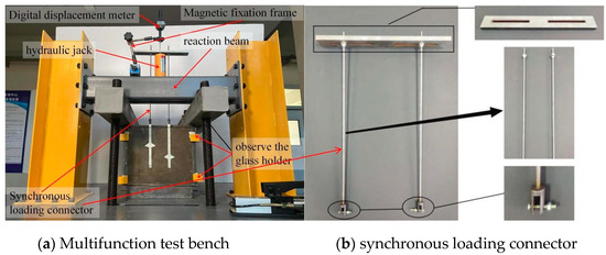 The multifunctional test bench used in this test is shown in Figure 6a. To ensure that each pile in the double pile was loaded synchronously, a synchronous loading connector designed by the research group was used. The elements of the connectors are shown in Figure 6b.
