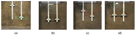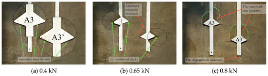 In the initial loading stage, the displacements at the tops of the two piles were small. When the load increased to 0.4 kN, the pile-soil separation occurred under the two pile plates, as indicated by the green arrows in Figure 7a. At the load of 0.65 kN, the soil at the ends of the two piles began to crack, as shown in Figure 7b, because the tensile stress was greater than the bond force between the particles simultaneously, and a slip zone began to appear on the plate, which is seen as a watermark in the test indicated by the red line in Figure 7b.