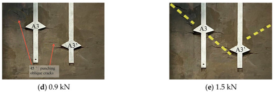 When the load increased to 0.9 kN, 45° punching oblique cracks began to appear on the upper left of the two piles, as shown in Figure 7d. The pile length L1 on the right pile plate was 6R (R is the cantilever diameter of the plates) and reached a reasonable uplift position; however, punching failure still occurred. This is because the central connection between the two plates was on the 45° punching extension line of the left pile, as shown in Figure 7e. This type of punching failure of the A3′ pile was due to the punching of the A3 pile, which is called “secondary punching failure” or “integral punching failure” of two piles. The secondary punching failure has a very adverse impact on the ultimate bearing capacity of two piles, which should be avoided in practical engineering. Furthermore, the angle of two adjacent pile plates with respect to the horizontal should not be close to 45°.