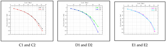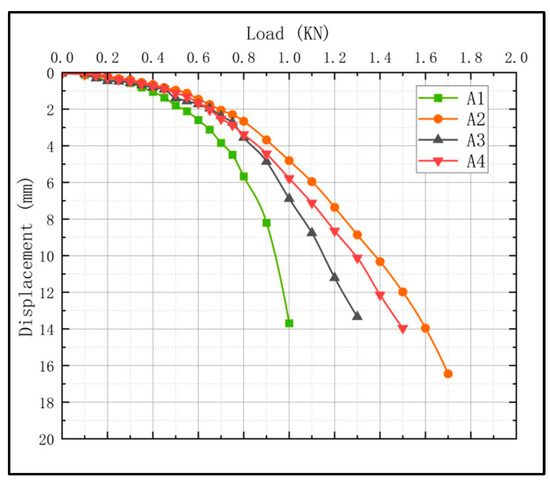 Analysis of the changes in the load-displacement curves in Figure 16 shows the following.