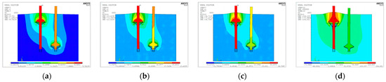 Before the load reached 300 kN, the pile top displacement increased linearly with the load, as shown in Figure 10a. When the displacement reached 20 mm, the load was approximately 600 kN, as shown in Figure 10b. The displacement at this time was much larger than the displacement caused by the same load when the plate is set at the same plate position, which shows that the bearing capacity is greatly reduced by setting the plate at the wrong position, mainly because the pile length L1 on the left pile plate is smaller than 2R. Because the position difference between the bearing plates of the two piles was too large, there was a large vertical displacement difference, which shows a color change in the contour. With an increase in the load, the displacement difference in the Y-direction of the two piles increased continuously. As shown in Figure 10c,d, a large uneven settlement would occur in real-world applications, which should be avoided in the design phase.