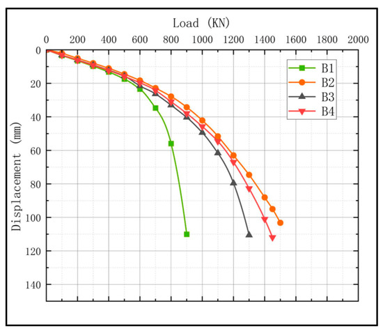 - By comparing curves B1 and B3 with cases B2 and B4, it was found that the bearing capacities of cases B1 and B3 were notably smaller than those of the latter, which shows that setting plates at staggered positions had a very unfavorable impact on the bearing capacity of the double piles.