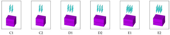 The above analysis proves that the basic assumptions and simulation parameters of the ANSYS finite element simulation are correct; therefore, piles four, six, and nine were primarily analyzed by finite element simulation. To avoid punching failure when L1 is less than 4R, and simultaneously avoid secondary punching failure or integral punching failure of the two piles, L1 values were selected as 5R and 8R, and the approximate modeling layouts are shown in Figure 12.