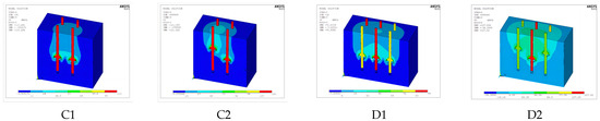 The stress curve of the C2 case was more irregular than that of the C1 case on the same plate. Although the stress of the C2 case was still near the load-bearing plate, the stresses on the left and right sides of the C2 case were quite different, and the maximum stresses of both the left and right piles were greater than that of the C1 case. Because the position of the right pile body plate was lower when it reached the limit state, its maximum stress was greater than that of the left pile. This is due to the vertical distance between the bearing plates, which leads to an uneven distribution of the force of among the piles in the pile group. A pile with a lower bearing plate position bears more force, which should be considered in the design calculations.