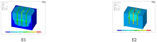 - In the nine-pile models, a comparison of E1 (plates at the same position) with E2 (staggered plate positions) showed that before the load reached 25 MPa, the nine-pile models performed similarly to the four- and six-pile models. However, when the load was between 25 and 62 MPa, the nine-pile model was fundamentally different from the four- and six-pile models. When the load reached 25 MPa, the influence of the Y-direction distance of the plates on the bearing capacity began to appear. Under the same load, the displacement of the E2 case was larger than that of the E1 case; however, the displacement difference between the two curves decreased continuously until the load reached 63 MPa because the soil pile group effect caused by the Y-direction distance of the load-bearing plates was almost the same as the pile group effect caused by the interaction between the plates. After reaching 62 MPa, the two curves exhibited different trends. Under the same load, the displacement of the E2 case was smaller than that of the E1 case, and failure occurred in this manner. This shows that with nine piles the bearing capacity is somewhat greater with staggered plates. Under a nine-pile arrangement, both the staggered and non-staggered plate positions were reasonable selections.