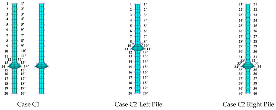 Points on both sides of the pile bodies of cases C1 and C2 were selected for stress analysis, as shown in Figure 14. After extracting the corresponding data, the XY direction stress diagrams of the pile bodies under the limit load state were drawn, as shown in Figure 15.