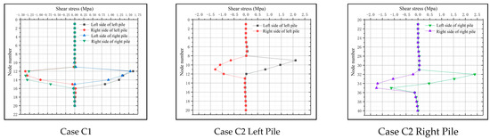 Under the action of the ultimate load, the stress of the C1 case changes greatly at three points, i.e., 12, 13, and 14, of the bearing plate position, indicating that the end bearing force provided by the bearing plate has a significant influence on the bearing performance of the uplift piles. This causes an excessive concentration of shear stress on the bearing plate and its adjacent piles, which has a stricter requirement for the strength of the bearing plate. The maximum value of the shear stress appears at position 12, that is, at the junction of the bearing plate and upper pile body. Compared with the shear stresses of positions 12 and 11, the value of the shear stress exhibits a sudden change, almost from zero to the maximum value, which is representative of the brittle failure of reinforced concrete materials.