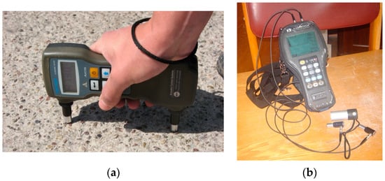 The ultrasonic tester “UK-1401” (“Acoustic Control Systems” company, Moscow, Russian Federation) was applied for the measurements of propagation velocities of longitudinal ultrasonic waves in concrete by using an indirect measurement method (Figure 1a). The main technical parameters of the device “UK-1401” are as follows: the measurement base (constant distance between the built-in dry point contact (DPC) transducers) of 150 ± 1 mm, an operational frequency of 70 kHz, an indication discreteness of the propagation time and velocity of ultrasonic waves of no more than ±1 %, and an operation temperature range from −20 °C to +50 °C.