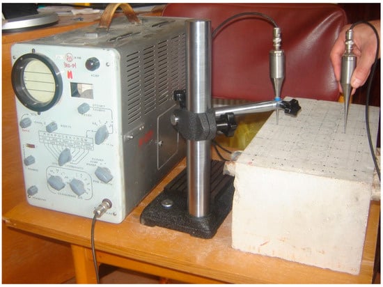An oscillograph, “UKB-1M” (AO “Introskop”, Chisinau, Moldova), was also applied to measure the UPV. This portable measuring device (see Figure 2) was equipped with two DPC exponential-type piezoelectric transducers with an operating frequency of 100 kHz. It is designed to determine the strength and identify concealed defects through the measurement of the propagation velocity of vibrations, evaluating the degree of their attenuation and analyzing the envelope pulse shapes. The technique relies on measuring the pulse propagation velocity and determining the value of the desired parameters using calibration charts or through a comparison with reference specimens. The information regarding the mode and time of ultrasonic wave propagation is reproduced in the form of an oscillogram. Both direct and indirect transmission methods are applied to determine the longitudinal and surface impulses.