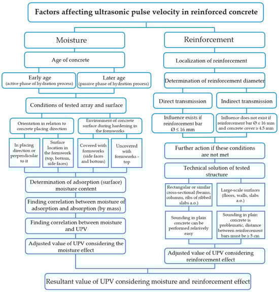 Flowchart outlines the steps involved in detecting and analyzing the effects of moisture and reinforcement when performing the UPV measurements in reinforced concrete structures [2].